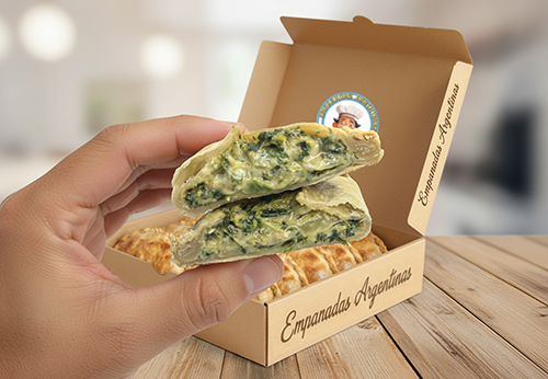 The most requested vegetarian empanada. We combine spinach with sautéed onion, bechamel sauce, nutmeg, oregano, paprika, black pepper, fine pieces of hard-boiled egg, mozzarella, and provolone cheese.