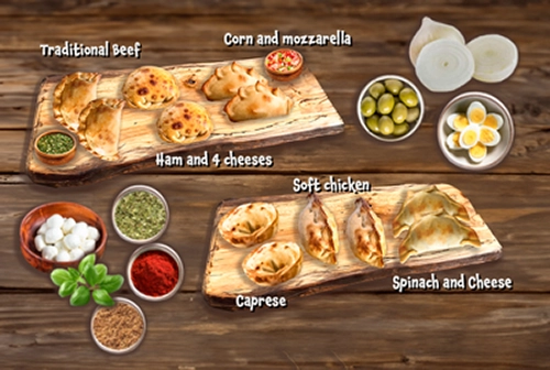 CP1 Traditional Beef, Ham & 5 Cheese, Soft Chicken, Spinach & Cheese, Caprese, Sweet Corn & Mozzarella (6 empanadas of each flavor)